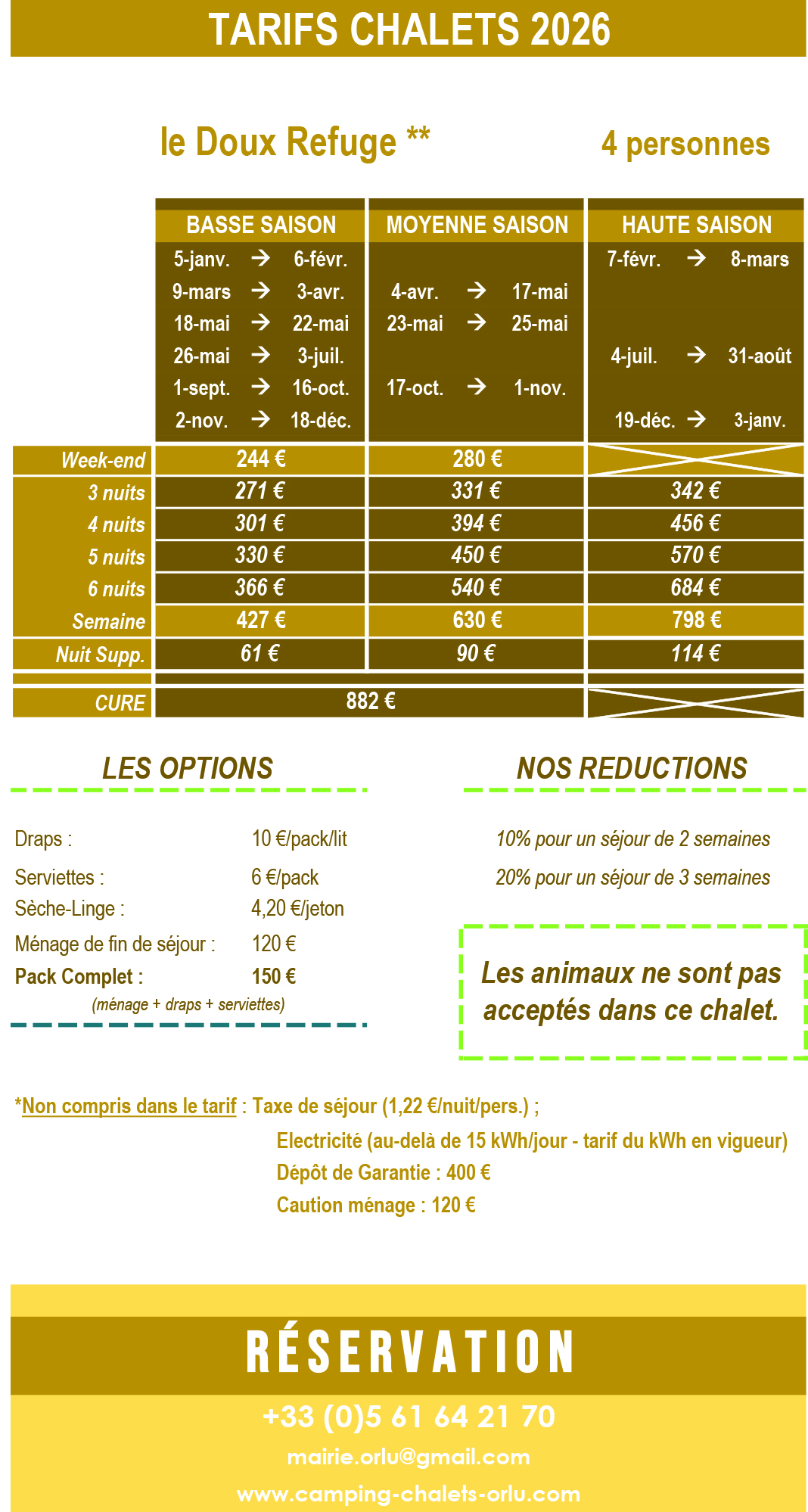 Notre « doux refuge » est situé au cœur de la vallée d’Orlu, à 850 m d’altitude, et il est idéalement placé pour des vacances nature, sportives ou en famille. Ce nouvel hébergement vient d’être entièrement rénové et bénéficie d’un classement Atout France 2 étoiles. Il possède 2 chambres pour une capacité de 4 personnes. Logement de 45 m² avec terrasse et petit jardin. Vue imprenable sur la montagne. Chemin de balade à proximité. Au cœur du complexe camping-chalets d’Orlu, vous pourrez bénéficier de tous les services : piscine, multisports, aire de jeux….